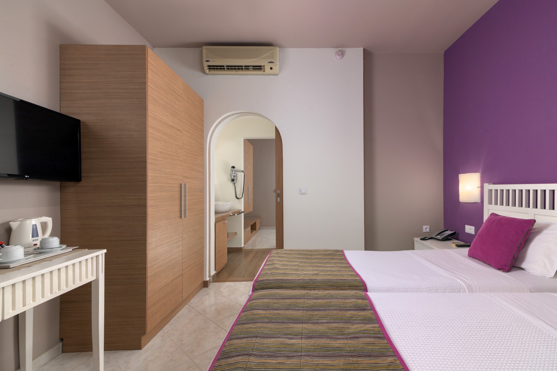 Aeolos family rooms (23 sq.m.) are stylishly decorated family rooms located solely in Aeolos building and can accommodate up to 4 persons in twin beds (can also form a double bed when pushed together with a mattress topper) in the master bedroom as well as a bunk bed sleeper sofa that offers two distinct beds in the separated living room (separated via normal door).